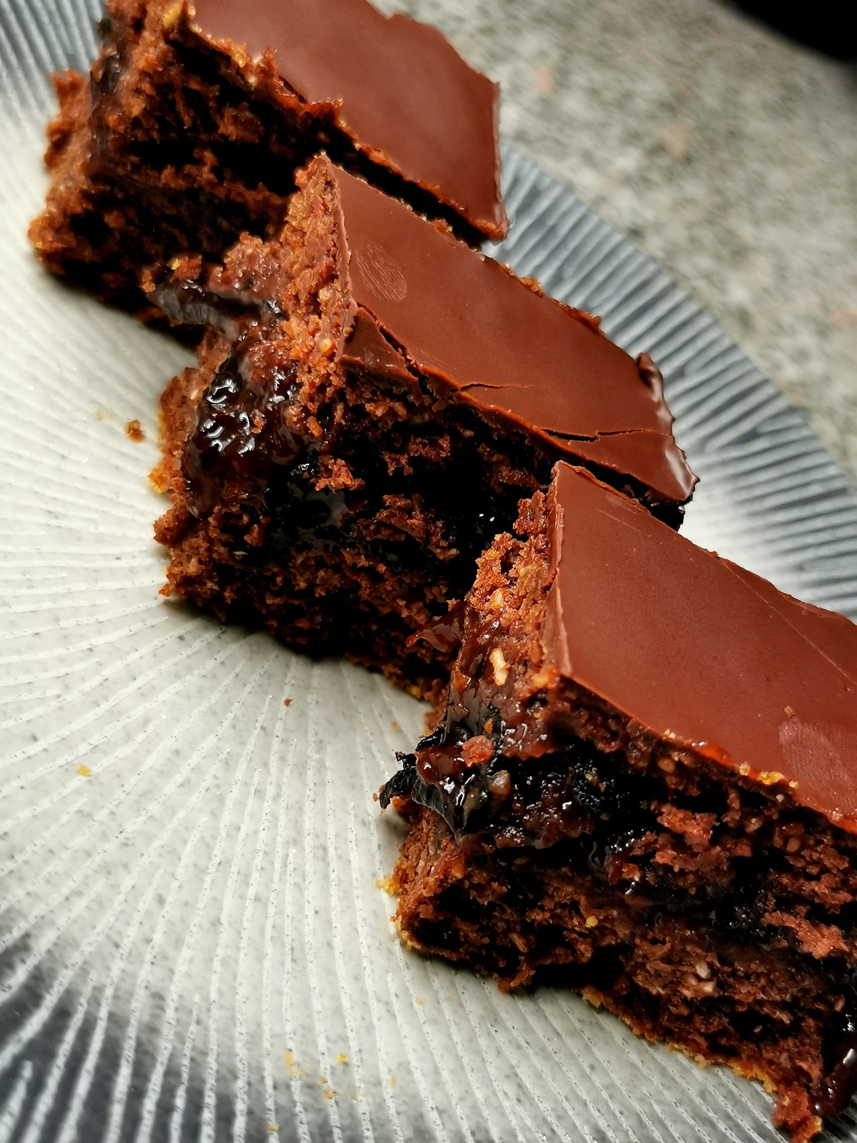 Preko ispečeno kolača prelijte glazurom od čokolade. Čokoladu usitnite i otopite sa uljem i odmah prelijte preko predhodno ohlađenog kolača. Okretanjem pleha sa kolačem u jednu, pa drugu stranu razlijte glazuru od čokolade i ostavite da se ohladi i stegne.