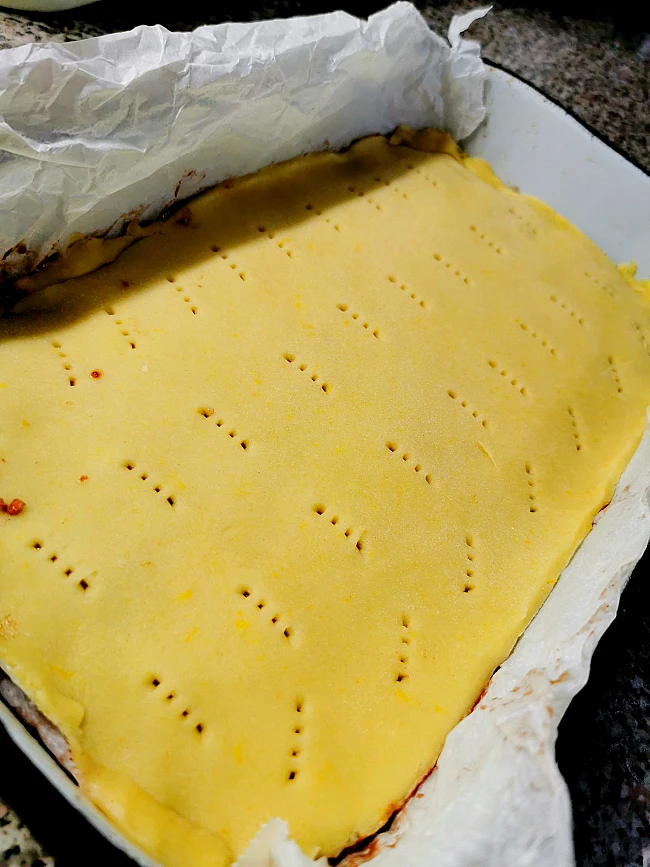 Važno je da gornju koru viljuškom dobro izbušite kako ne bi prilikom pečenja došlo do pucanja kore. Pitu pecite na 180C nekih 35 minuta...