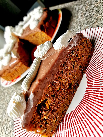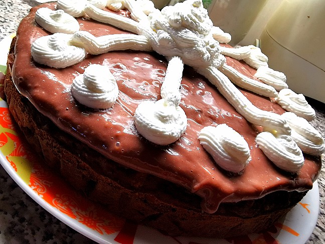 Kada se puding prohladi mikserom sam ga izmešao i premazao ga preko ohlađenog biskvita kojeg sam izvadio i stavio u tanjir za serviranje. Šlag sam umutio i njime ukrasio tortu!