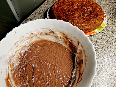 E sad preko tog biskvita možete po vašoj želji i volji staviti šlag, ili neki drugi preliv, a ja sam stavio puding od čokolade. Skuvani puding sam prebacio u činiju prekrio ga plastičnom folijom tako da dodiruje puding u ostavio ga da se ohladi. Folija se stavlja kako se ne bi stvorila korica na pudingu.
