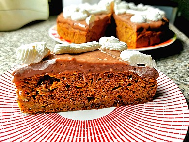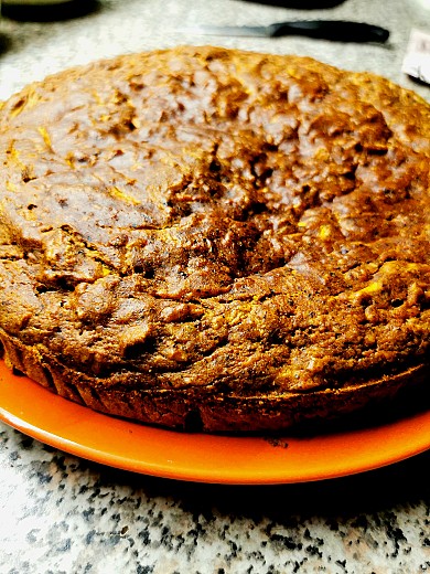 Kada su se sjedinili sastojci dodao sam kikiriki maslac i kako je smesa bila pregusta dodao sam oko 1dl mleka - napitak od lešnika i sve dobro izmiksao. Nakon toga sam dodao i narendanu tikvu sve sjedinio i prebacio u okrugli pleh veličine 24 cm i pekao na 200 stepeni oko 40 minuta. U taj pleh sam na dno stavio pek papir da se biskvit ne zalepi tokom pečenja. Na kraju pečenja proverite čačkalicom da li je biskvit ispečen, u koliko je čačkalica suva kada ubodete i izvadite je onda je pečen.
