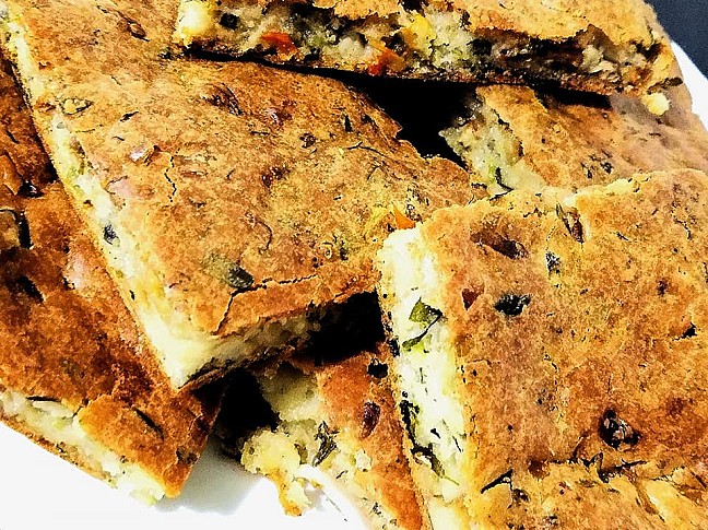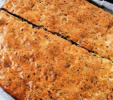 E sad, ja sam dodao i ljute tucane paprike, a vi u koliko ne volite ljuto, onda to ne morate. Sve sam lepo promešao da se sjedini (testo je gušće od testa za palačinke), i sipao u pleh predhodno namašćeni i postavljenog papira za pečenje. Stavio da se peče u zagrejanu rernu na 180 stepeni na oko 35 min, (manje ili više u zavisnosti koliko ste debeli sloj sipali). Proverite čačkalicom da li je pečeno. Prijatno vam bilo!